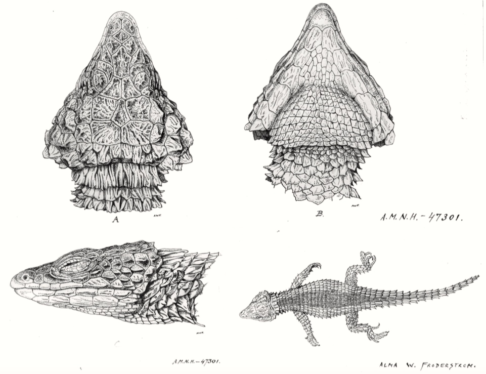 Além dos dez exemplares apanhados há pouco tempo (oito na expedição de 2013 e dois pelos cientistas sul-africanos em 2009), conhecem-se outros 50 espécimes, atribuídos agora à nova espécie, que estão no Museu Americano de História Natural (foram recolhidos numa expedição a Angola em 1925, financiada por Arthur S. Vernay, que fez fortuna como antiquário). A imagem que se segue é uma ilustração científica de um exemplar deCordylus (por Alma W. Froderstrom) resultante dessa expedição de 1925 e que se encontra no Museu Americano de História Natural.