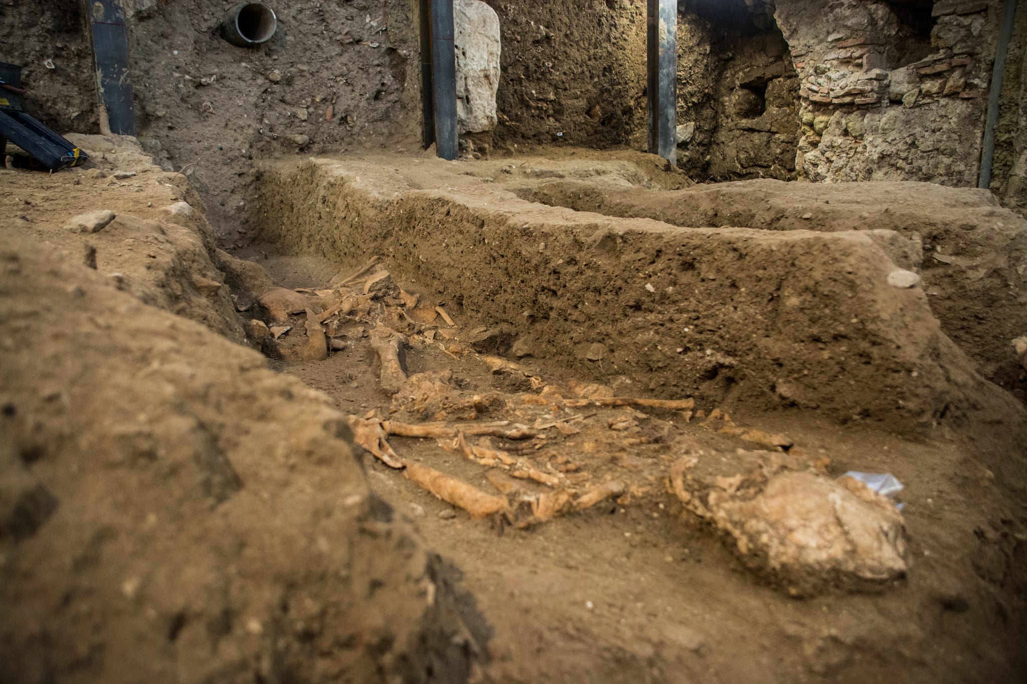 Já fora do poço que foi escavado, e no qual na manhã de sexta-feira estavam à vista vários cadáveres (incluindo o de uma criança), há vários elementos pousados no chão, enquanto decorre o processo de estudo pelos arqueólogos da empresa Arqueologia e Património.
